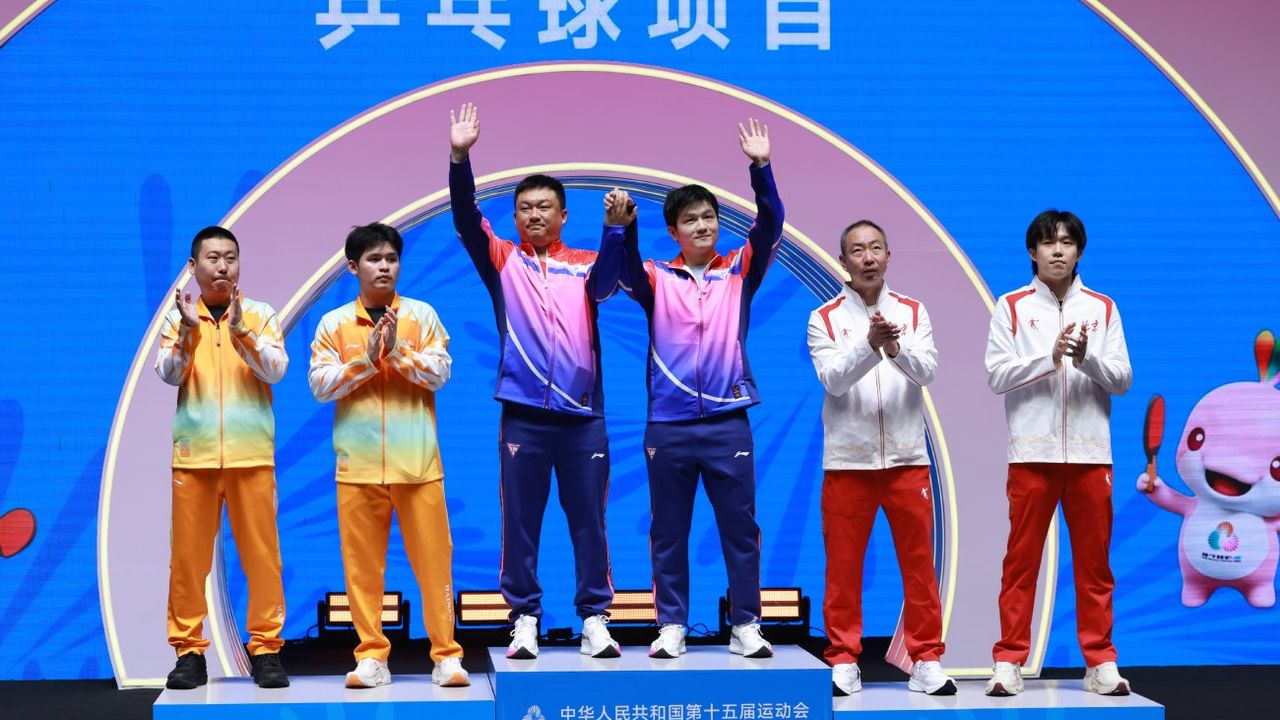 MAKAO, 16 Kasım (Xinhua) -- Çin'in güneyindeki Makao'da düzenlenen 15. Çin Ulusal Oyunları'nda masa tenisi erkekler bireysel kategorisi ödül töreninde Shanghai'dan altın madalya sahibi Fan Zhendong (sağda 3. sırada), Hainan'dan gümüş madalya sahibi Lin Shidong (solda 2. sırada) ve Beijing'den bronz madalya sahibi Wang Chuqin (sağda 1. sırada) antrenörleriyle birlikte poz veriyor, 16 Kasım 2025. (Fotoğraf: Liang Xu/Xinhua)■