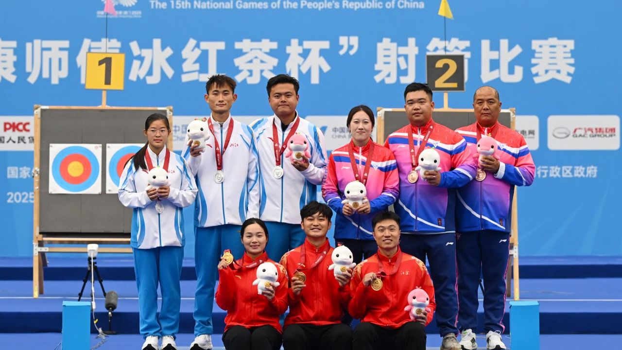 SHENZHEN, 20 Kasım (Xinhua) -- Çin'in güneyindeki Guangdong eyaletinin Shenzhen kentinde düzenlenen 15. Çin Ulusal Oyunları'nda okçuluk karışık takım finalinin ardından düzenlenen ödül töreninde altın madalya kazanan Jiangsu'dan Zhang Xinyan/Ding Yiliang, gümüş madalya kazanan Zhejiang'dan Li Xinxu/Zheng Xinghuan ve bronz madalya kazanan Shanghai'dan Yao Yao/Zhang Zilei ve antrenörleri, 20 Kasım 2025. (Fotoğraf: Hao Yuan/Xinhua)■