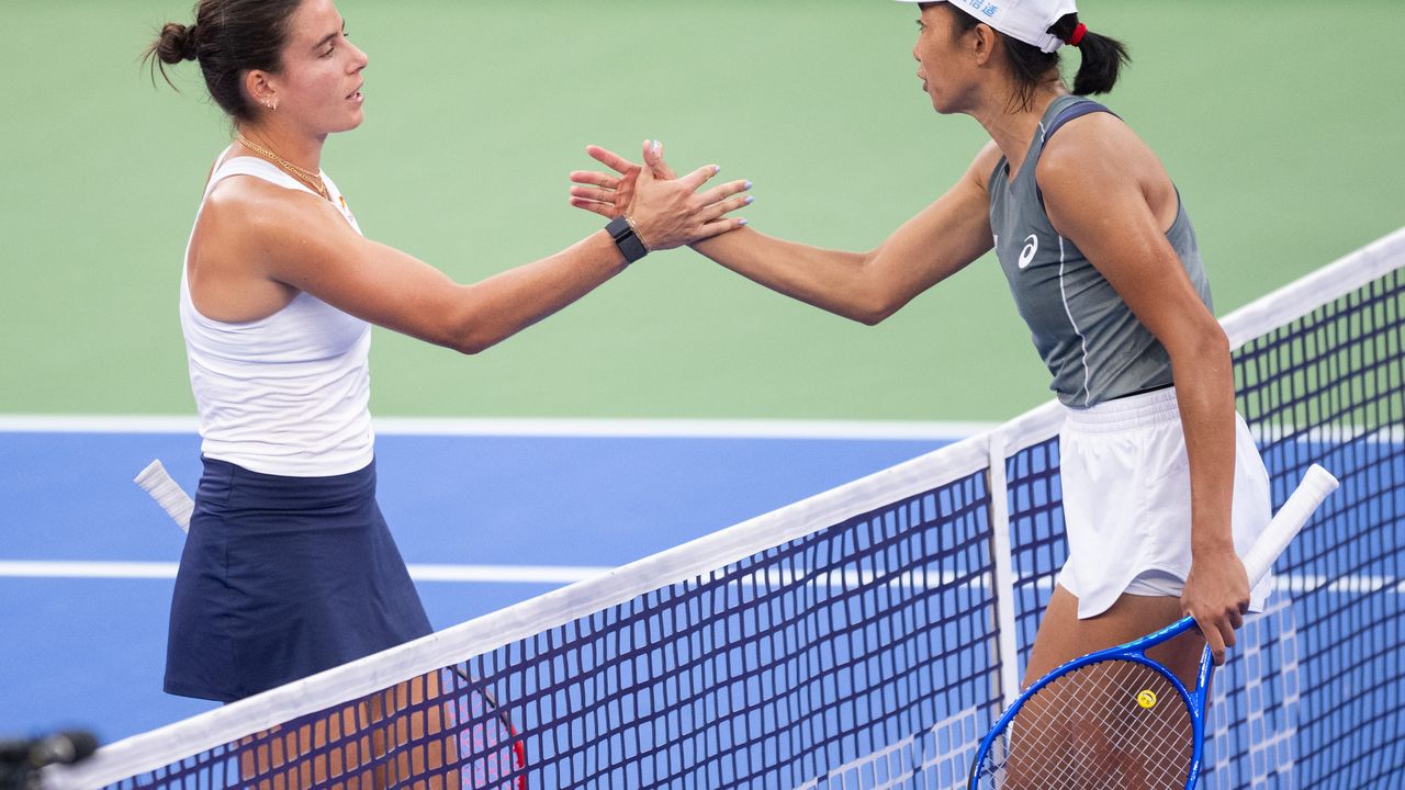 WUHAN, 7 Ekim (Xinhua) -- Çin'in orta kesimindeki Hubei eyaletinin merkezi Wuhan'da düzenlenen 2025 Wuhan Açık Tenis Turnuvası'nda kadınlar son 64 turu tekler maçının ardından ABD'li sporcu Emma Navarro ile el sıkışan Çinli sporcu Zhang Shuai (sağda), 7 Ekim 2025. Çinli deneyimli tenisçi Zhang Shuai salı günü düzenlenen Wuhan Açık turnuvasının ilk turunda 14 numaralı seri başı Emma Navarro'yu 6-2, 2-6, 6-3'lük setlerle mağlup etti. (Fotoğraf: Xiao Yijiu/Xinhua)■