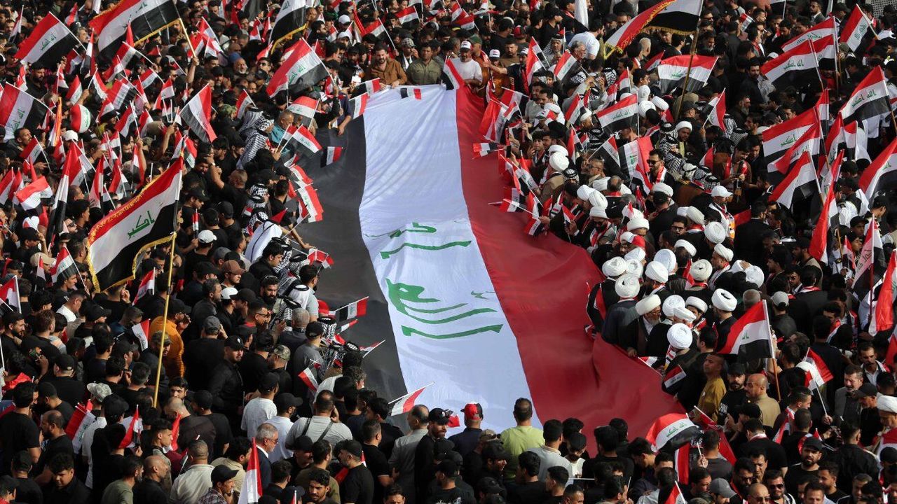 BAĞDAT, 5 Nisan (Xinhua) -- Irak'ın başkenti Bağdat'ta binlerce kişi ABD ve İsrail'in İran'a yönelik saldırılarını protesto etti, 4 Nisan 2026. (Fotoğraf: Khalil Dawood/Xinhua)■