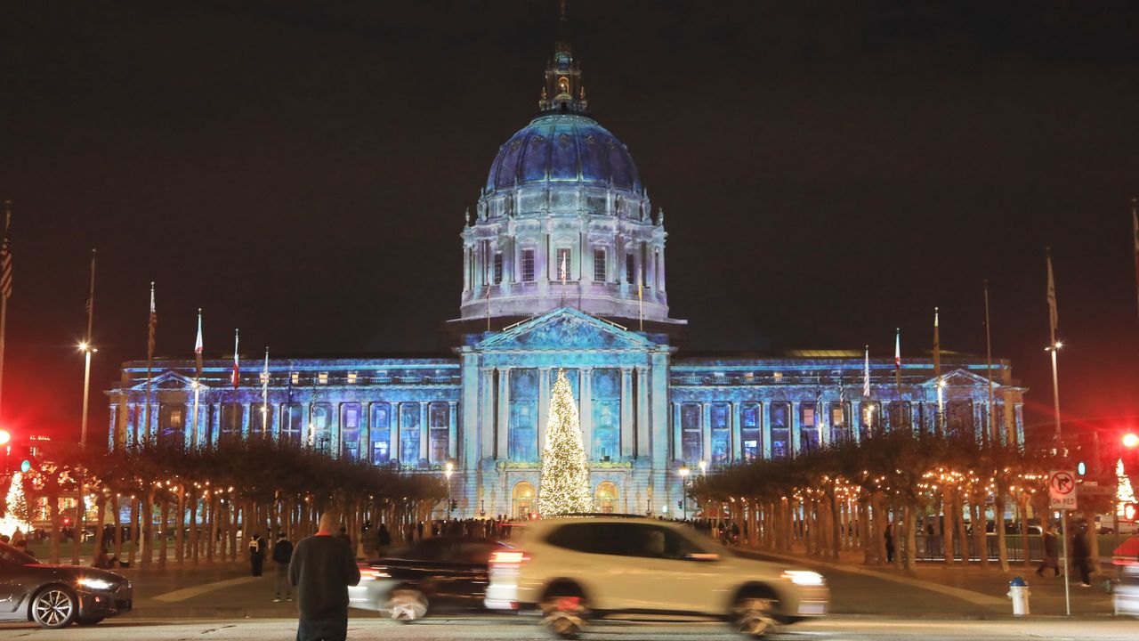 SAN FRANCISCO, 17 Aralık (Xinhua) -- ABD'nin San Francisco kentindeki Belediye Binası'nın önünde düzenlenen 'Belediye Binası Kış Işıkları' gösterisi, 16 Aralık 2025. (Fotoğraf: Liu Yilin/Xinhua)■