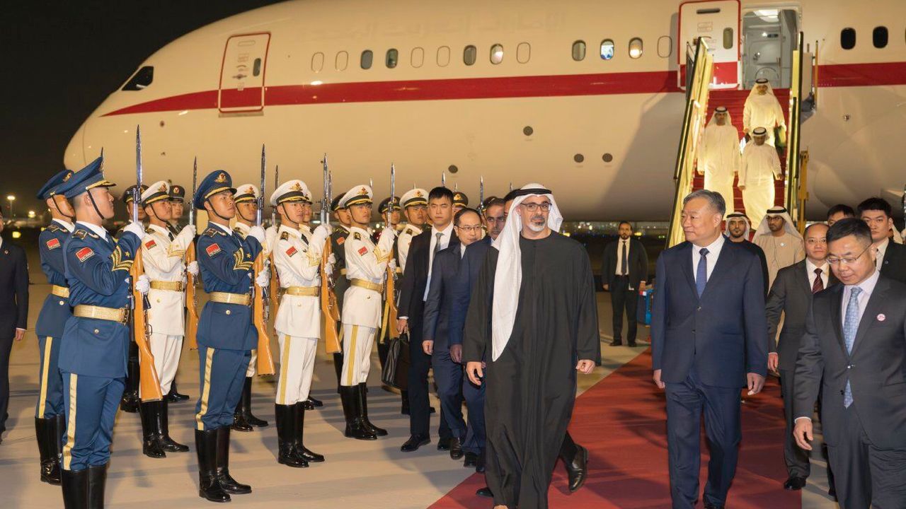 BEİJİNG, 13 Nisan (Xinhua) -- Birleşik Arap Emirlikleri'nin Abu Dabi Veliaht Prensi Şeyh Halid bin Muhammed bin Zayid Al Nahyan, 12-14 Nisan tarihleri arasında Çin'de gerçekleştireceği resmi ziyaretler kapsamında başkenti Beijing'e geldi, 12 Nisan 2026. (Fotoğraf: Cai Yang/Xinhua)■