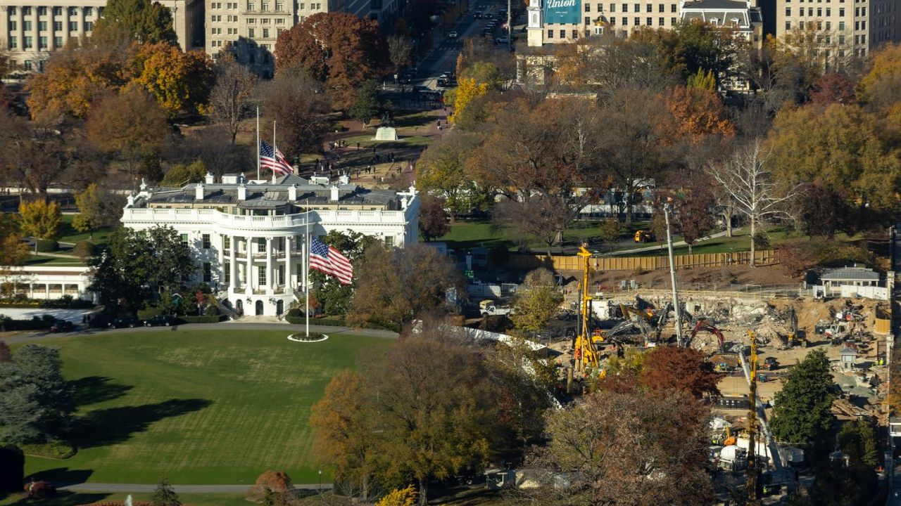 WASHINGTON, 18 Kasım (Xinhua) -- ABD'nin başkenti Washington DC'de bulunan Washington Anıtı'nın üzerinden çekilen fotoğrafta Beyaz Saray'ın yıkılan Doğu Kanadı görülüyor, 17 Kasım 2025. Kısa süre önce yıkılan Doğu Kanadı'nın yerine inşa edilecek yeni balo salonu için inşaat ekipleri hazırlıklarını sürdürüyor. (Fotoğraf: Hu Yousong/Xinhua)■