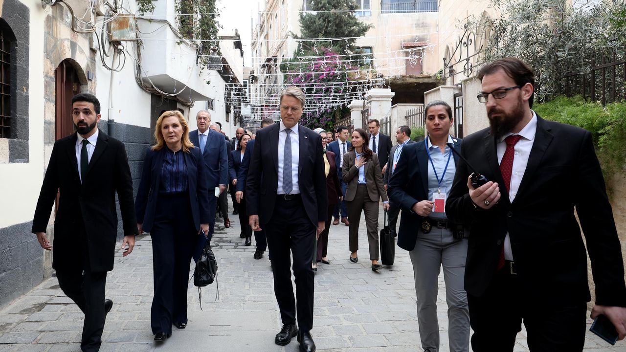 ŞAM, 5 Aralık (Xinhua) -- Suriye'nin başkenti Şam'ı ziyaret eden Birleşmiş Milletler Güvenlik Konseyi heyeti üyeleri, 4 Aralık 2025. Birleşmiş Milletler Güvenlik Konseyi heyeti, perşembe günü Suriye'ye bir ziyaret gerçekleştirdi. Ziyaret, Suriye eski Devlet Başkanı Beşar Esad'ın Aralık 2024'te devrilmesinin ardından iktidara gelen yetkililerle yapılan ilk üst düzey temas oldu. (Fotoğraf: Ammar Safarjalani/Xinhua)