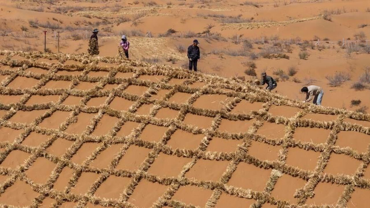 ZHONGWEİ, 12 Nisan (Xinhua) -- Çin'in Zhongwei kentinde işçiler, çöl kontrol verimliliğini artırmak amacıyla Tengger Çölü'ndeki mevcut bariyerleri kare şeklinde yeni saman bariyerlerle yeniliyor.