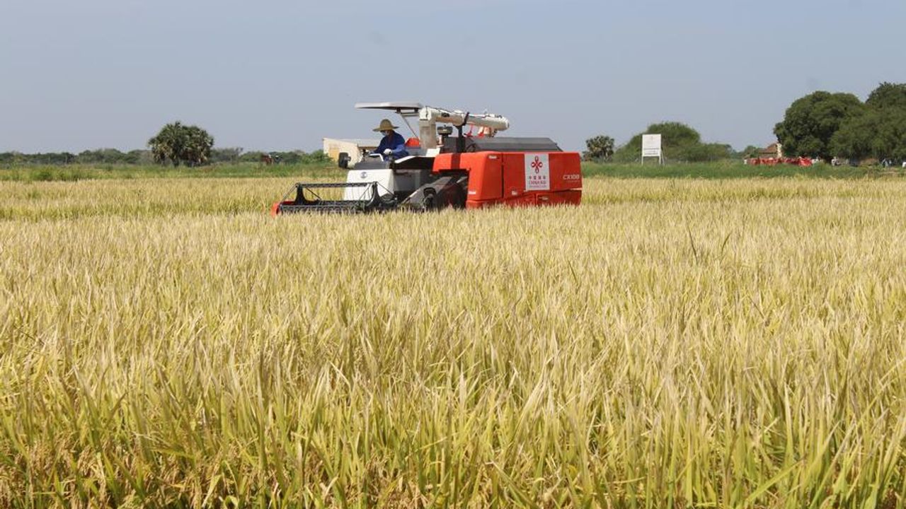 Yerel yetkililer ve üst düzey hükümet yetkilileri kutlamalara katılarak, Çinli bir tarım uzmanının yeni hasat makinesini çalıştırmasını ilgiyle izledi.