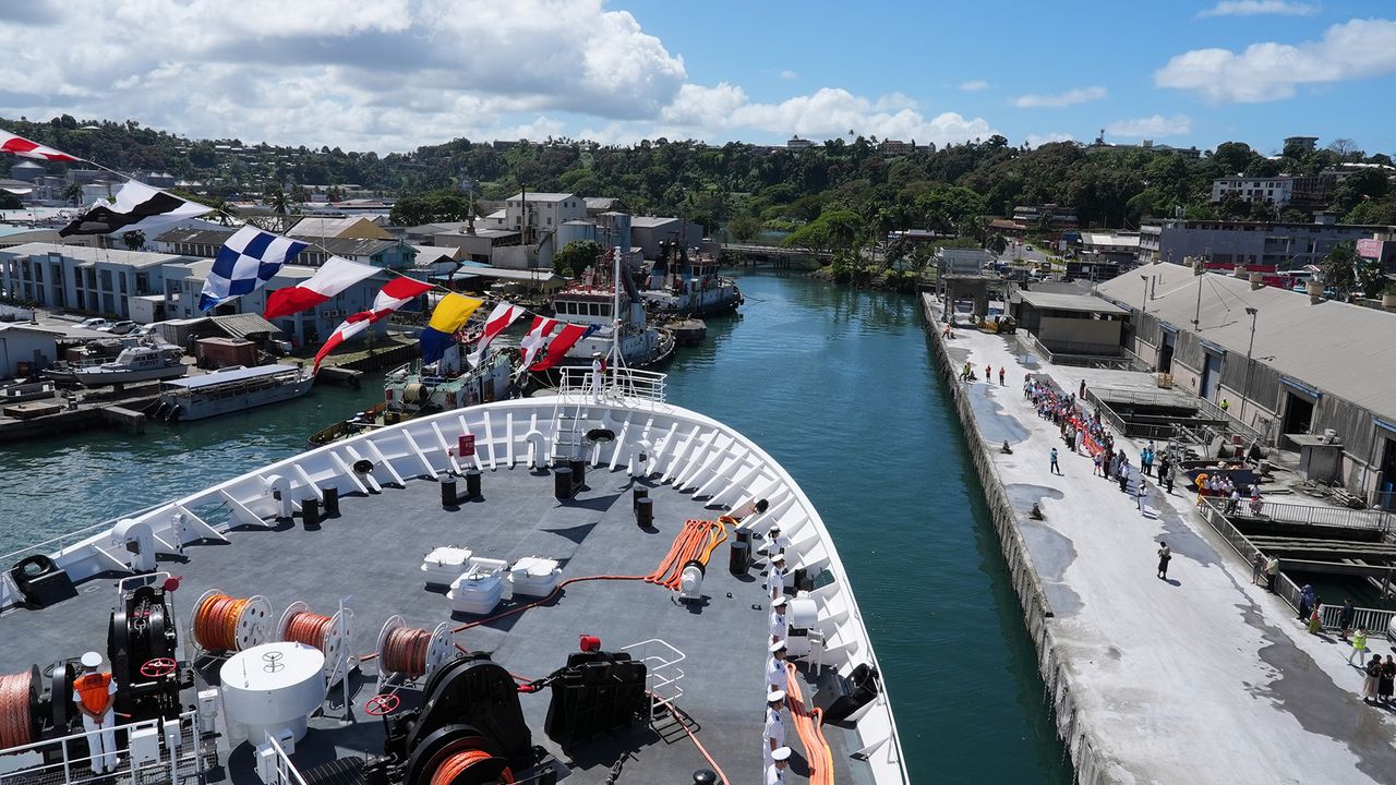 SUVA, 7 Ekim (Xinhua) -- Fiji'nin başkenti Suva'daki Suva Limanı'na giriş yapan Çin donanmasına ait 'İpek Yolu Gemisi', 1 Ekim 2025. Çin donanmasına ait 'İpek Yolu Gemisi', Fiji'nin başkenti Suva'ya yedi günlük bir dostluk ziyareti ve insani sağlık hizmeti görevi gerçekleştirdi. 1 Ekim'de başlayan ziyaret, geminin bu ülkeye yaptığı ilk ziyaret olma özelliğini taşıyor. Geminin, Fiji'de bulunduğu süre içinde 1.241 tıbbi muayene ve 187 cerrahi operasyon gerçekleştirildi. (Fotoğraf: Zhang Dongjie/Xinhua)■