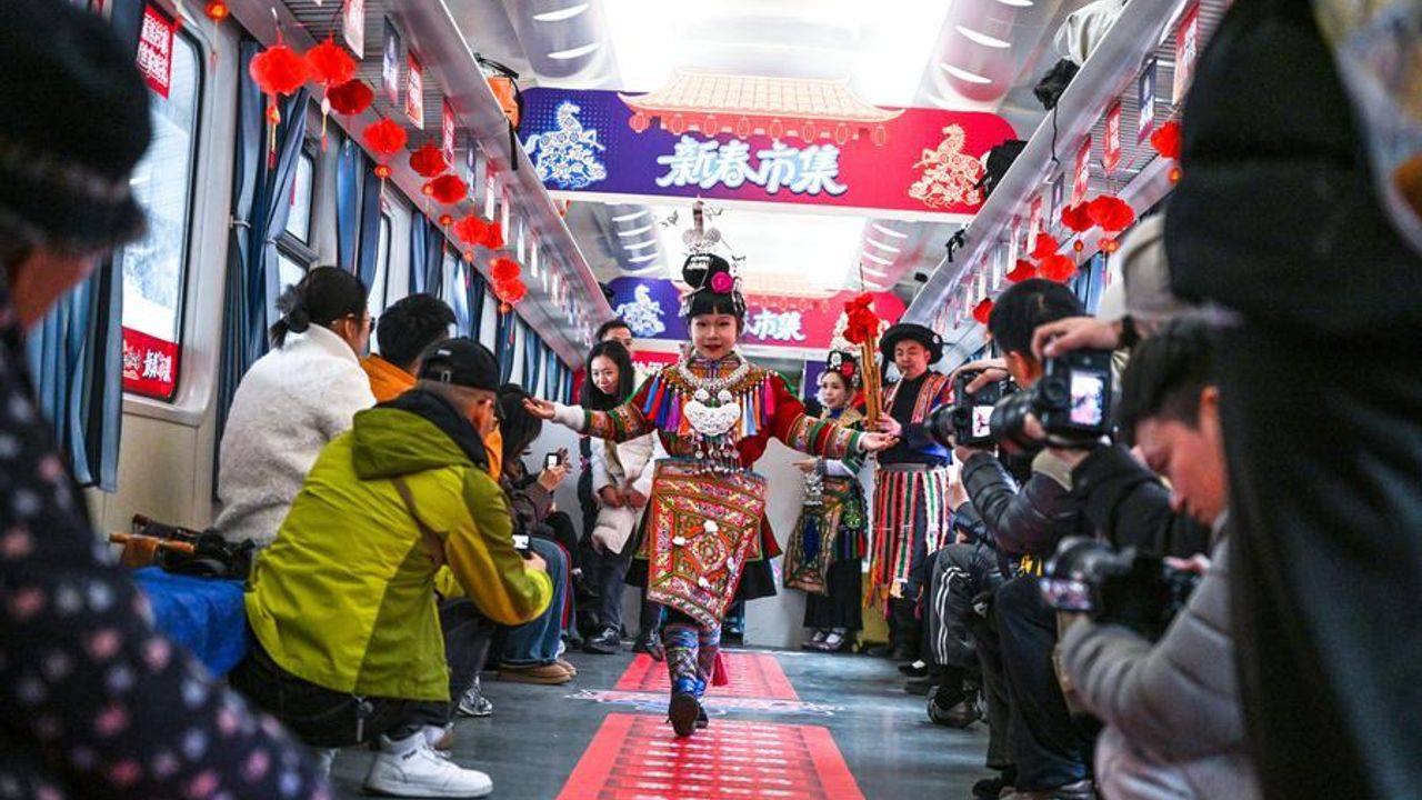 Çin Yeni Yılı dolayısıyla trende, yolcular için taze tarım ürünlerinin ve halk geleneklerinin tanıtıldığı etkinlik renkli görüntülere sahne oldu.