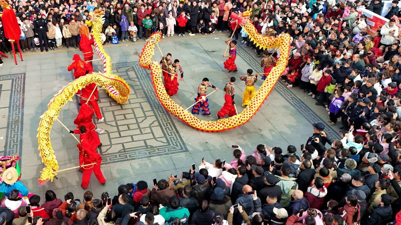 BEİJİNG, 5 Şubat (Xinhua) -- Havadan drone ile çekilen fotoğrafta, Çin'in orta kesimindeki Henan eyaletinin Nanyang kentinde ejderha dansını izleyen insanlar görülüyor, 4 Şubat 2026. Çin'in güneş esaslı geleneksel takviminde, 24 güneş teriminin ilki olan ve baharın başlangıcı kabul edilen 'Lichun' çarşamba günü başladı. (Fotoğraf: Gao Song/Xinhua)■
