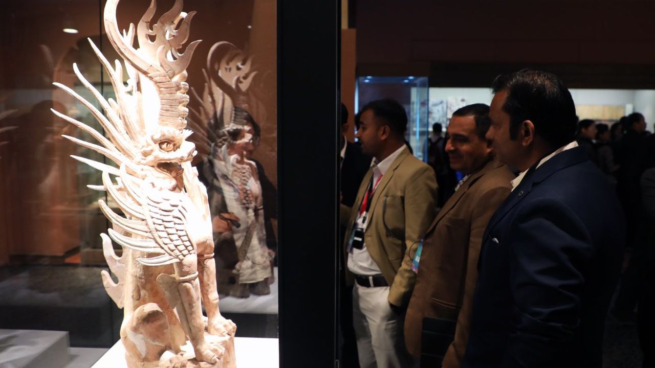 DUNHUANG, 13 Ekim (Xinhua) -- Çin'in kuzeybatısındaki Gansu eyaletinin Dunhuang kentindeki Dunhuang Müzesi'ni ziyaret eden uluslararası konuklar, 13 Ekim 2025. Türkiye, İtalya, Ermenistan, Nepal ve diğer ülkelerden gelen konuklar, 11 ve 12 Ekim tarihlerinde düzenlenen Dunhuang Küresel Belediye Başkanları Diyaloğu etkinliği kapsamında kentin kültürel simge yapılarını ziyaret ederek zengin tarihi atmosferi yakından deneyimledi. (Fotoğraf: Wang Shengyuan/Xinhua)■