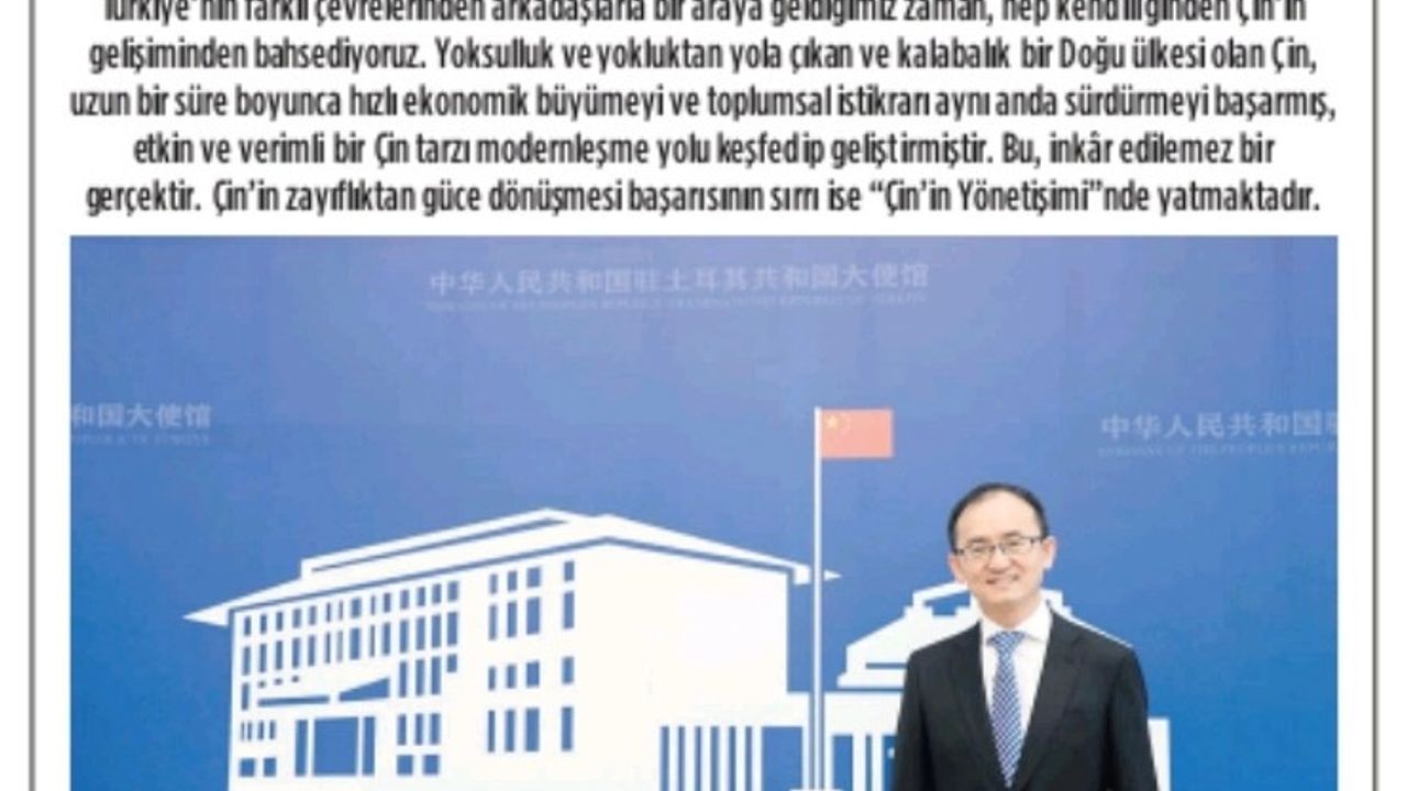 'Türkiye'nin farklı çevrelerinden arkadaşlarla bir araya geldiğimiz zaman, hep kendiliğinden Çin'in gelişiminden bahsediyoruz. Yoksulluk ve yokluktan yola çıkan ve kalabalık bir Doğu ülkesi olan Çin, uzun bir süre boyunca hızlı ekonomik büyümeyi ve toplumsal istikrarı aynı anda sürdürmeyi başarmış, etkin ve verimli bir Çin tarzı modernleşme yolu keşfedip geliştirmiştir. Bu, inkar edilemez bir gerçektir. Çin'in zayıflıktan güce dönüşmesi başarısının sırrı ise Çin'in yönetişiminde yatmaktadır.