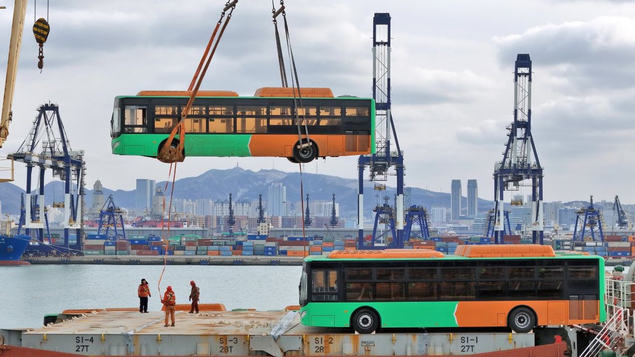 Havadan drone ile çekilen fotoğrafta, Çin'in doğusundaki Shandong eyaletinin Yantai Limanı'ndan hareket eden Meksika'ya ihraç edilen doğalgazla çalışan otobüslerle yüklü bir gemi görülüyor, 6 Şubat 2026. (Fotoğraf: Zhang Chao/Xinhua)Havadan drone ile çekilen fotoğrafta, Çin'in doğusundaki Shandong eyaletinin Yantai Limanı'nda bir gemiye yüklenen Meksika'ya ihraç edilecek doğalgazla çalışan otobüsler görülüyor, 6 Şubat 2026. (Fotoğraf: Tang Ke/Xinhua)■