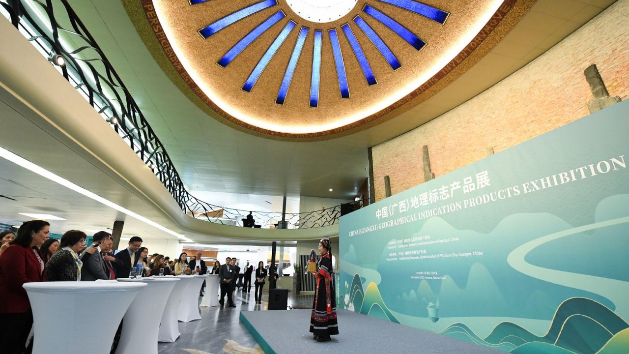 CENEVRE, 18 Kasım (Xinhua) -- İsviçre'nin Cenevre kentinde Dünya Fikri Mülkiyet Örgütü Genel Merkezi'nde düzenlenen Çin (Guangxi) Yerel Ürünler Sergisi'ni ziyaret eden insanlar, 17 Kasım 2025. Pazartesi günü başlayan ve iki gün sürecek sergide Çin'in güneyindeki Guangxi Zhuang Özerk Bölgesi'nin çay, çömlek ve bambu dokuma zanaatı gibi simgesel ürünleri sergileniyor. (Fotoğraf: Lian Yi/Xinhua)■