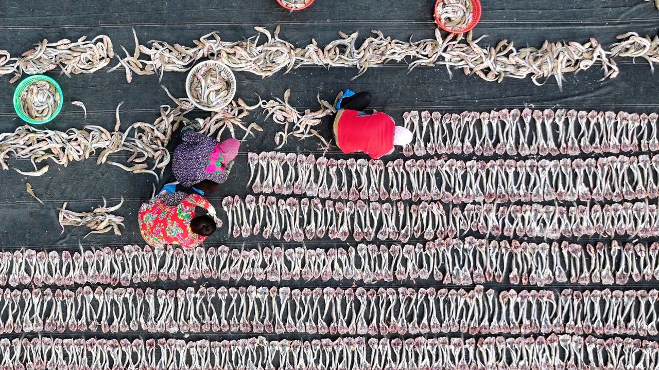 SHİJİAZHUANG, 1 Aralık (Xinhua) -- Çin'in Hebei eyaletinin Tangshan kentinin Fengnan bölgesinde güzel havayı fırsat bilen balıkçılar balık, karides ve diğer deniz ürünlerini işleyip kurutarak pazara tedarik ediyor.