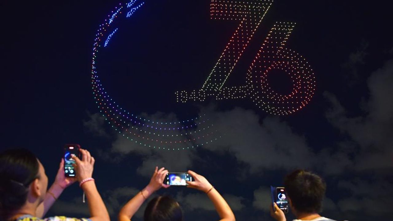 HONG KONG, 3 Ekim (Xinhua) -- Çin Halk Cumhuriyeti'nin kuruluşunun 76. yıldönümü kutlamaları kapsamında Çin'in çeşitli bölgelerinde drone'lu ışık gösterileri düzenleniyor.