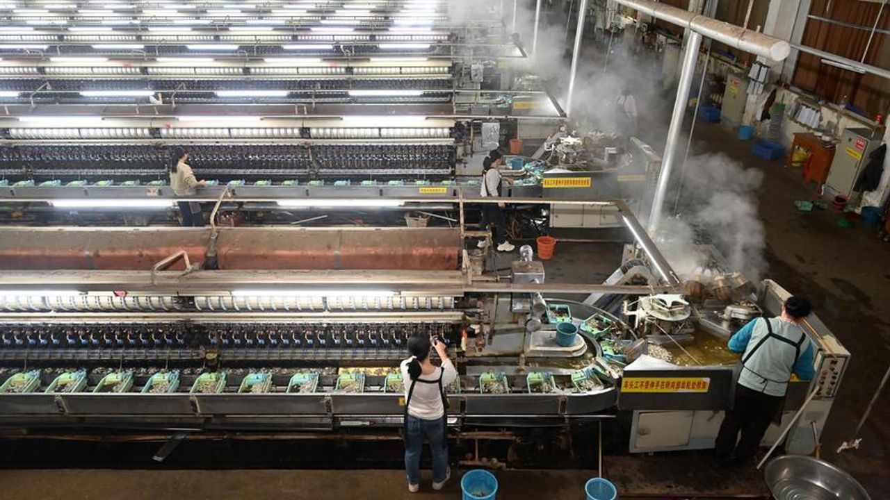 Çin'in güneyindeki Guangxi Zhuang Özerk Bölgesi'nin Laibin kentinin Xincheng ilçesindeki bir ipek fabrikasında çalışan işçiler, 4 Kasım 2025. (Fotoğraf: Lu Boan/Xinhua)