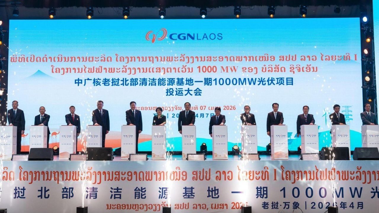 VİYENTİYAN, 9 Nisan (Xinhua) -- Çin Genel Nükleer Enerji Grubu tarafından inşa edilen 1.000 megavatlık fotovoltaik enerji projesinin faaliyete geçmesi dolayısıyla Laos'un başkenti Viyentiyan'da bir tören düzenlendi, 7 Nisan 2026. (Fotoğraf: Kaikeo Saiyasane/Xinhua)■