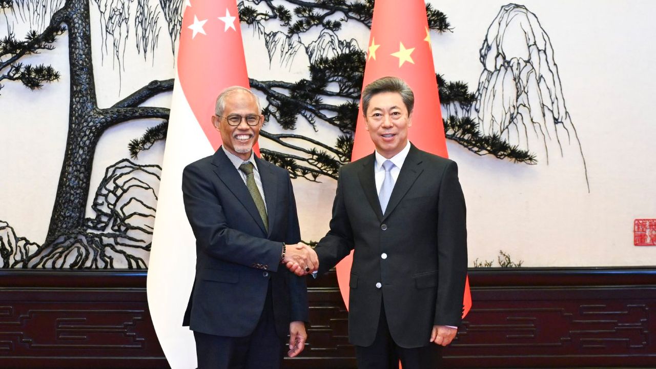 BEİJİNG, 17 Ekim (Xinhua) -- Çin Komünist Partisi (ÇKP) Merkez Komitesi Siyasi Bürosu Üyesi ve ÇKP Merkez Komitesi Siyasi ve Hukuki İşler Komisyonu Başkanı Chen Wenqing (sağda), Çin'in başkenti Beijing'de Singapur Aile ve Sosyal Kalkınma Bakanı Masagos Zulkifli ile bir araya geldi, 15 Ekim 2025. (Fotoğraf: Yan Yan/Xinhua)■