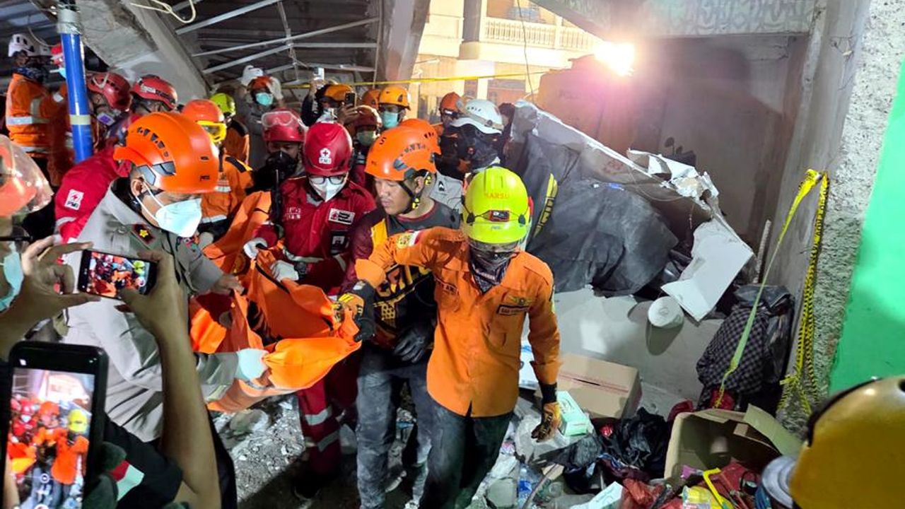 Endonezya'nın Doğu Cava eyaletindeki Sidoarjo bölgesinde bulunan El Khoziny İslam Yatılı Okulu'nun çöken binasından kurtulan bir kişiyi tahliye eden kurtarma ekibi üyeleri, 1 Ekim 2025. (Endonezya Ulusal Arama Kurtarma Servisi/Dağıtım Xinhua aracılığıyla)