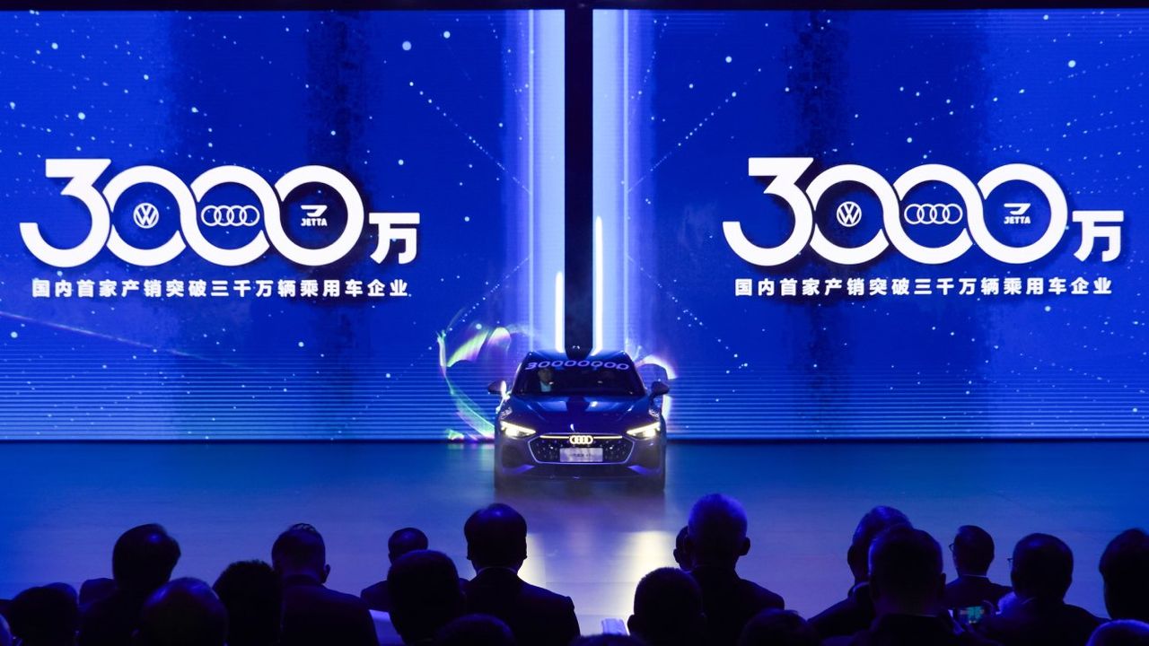 CHANGCHUN, 31 Ekim (Xinhua) -- Çin'in kuzeydoğusundaki Jilin eyaletinin merkezi Changchun'da düzenlenen bir törende sergilenen FAW-Volkswagen tarafından üretilen 30 milyonuncu otomobil, 30 Ekim 2025. Çin'in Jilin eyaletinin merkezi Changchun'da perşembe günü FAW-Volkswagen üretim hattından çıkan 30 milyonuncu otomobili kutlamak için tören düzenlendi. (Fotoğraf: Xu Chang/Xinhua)■