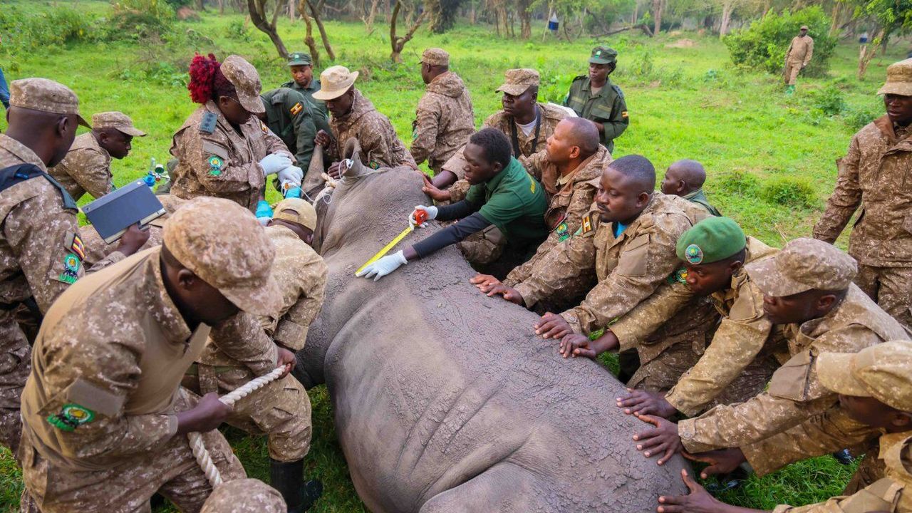 KAMPALA, 18 Mart (Xinhua) -- Uganda'nın kuzeydoğusundaki Kidepo Vadisi Ulusal Parkı'nda bir güney beyaz gergedanını taşımak için düzenlenen ortak operasyon, 17 Mart 2026. Uganda, salı günü güney beyaz gergedanlarının ülkenin kuzeydoğusundaki Kidepo Vadisi Ulusal Parkı'na aşamalı olarak taşınmasını başlatarak, bu türün 40 yılı aşkın bir sürenin ardından bölgeye geri dönüşünü sağladı. (Fotoğraf: Ronald Amutuhire/Xinhua)■