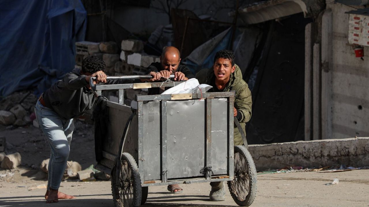 GAZZE, 9 Ocak (Xinhua) -- Dünya Gıda Programı aracılığıyla Gazze'deki bir dağıtım merkezinden gıda yardımı alan Filistinliler, 8 Ocak 2026. (Fotoğraf: Rizek Abdeljawad/Xinhua)■