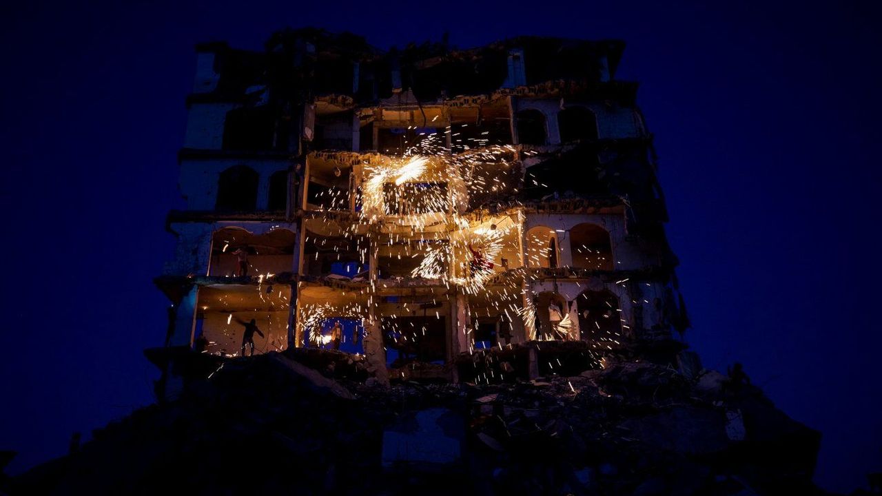 GAZZE, 25 Şubat (Xinhua) -- Gazze Şeridi'nin kuzeyindeki Cibaliye Mülteci Kampı'nda yıkılmış bir binada ramazan dolayısıyla havai fişek patlatan insanlar, 23 Şubat 2026. (Fotoğraf: Rizek Abdeljawad/Xinhua)■
