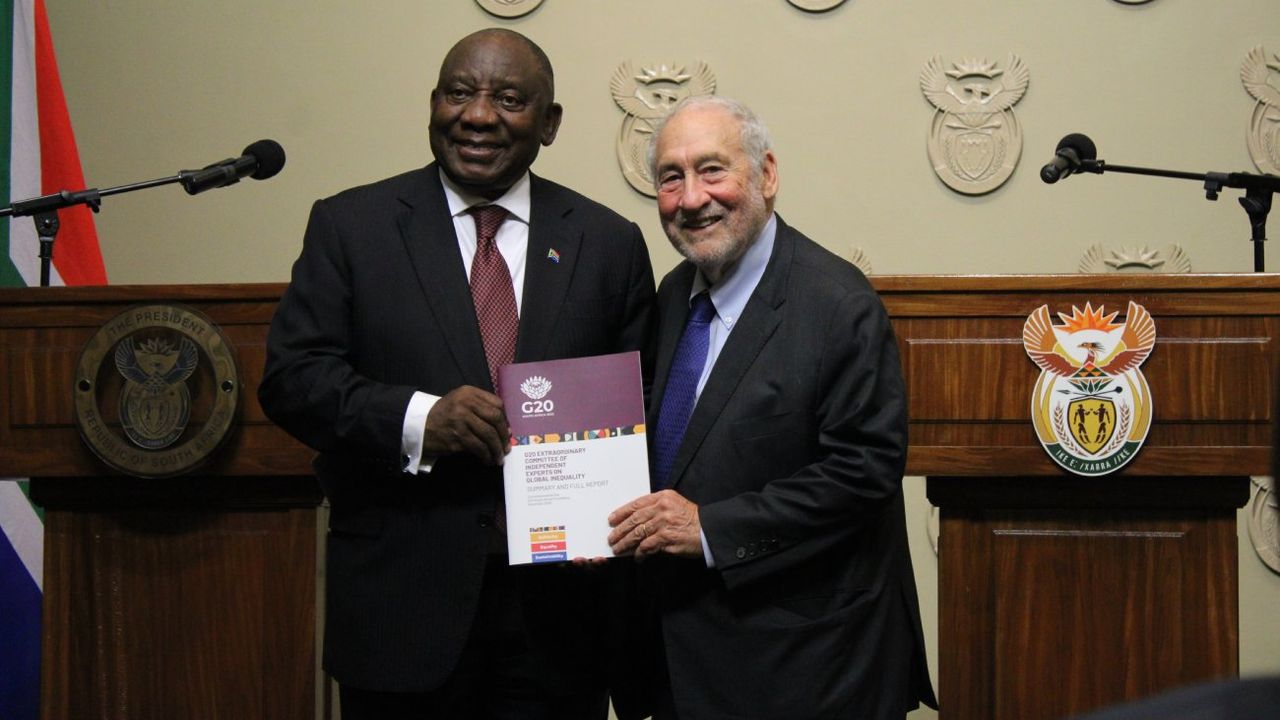 CAPE TOWN, 5 Kasım (Xinhua) -- Güney Afrika Cumhurbaşkanı Cyril Ramaphosa (solda), Güney Afrika'nın başkenti Cape Town'da düzenlenen törende Nobel ödüllü Joseph Stiglitz'den G20 Olağanüstü Komitesi'nin Küresel Eşitsizlik Raporu'nu teslim alıyor, 4 Kasım 2025. Güney Afrika'nın G20 dönem başkanlığında hazırlanan bir rapor, derinleşen küresel eşitsizlik krizine dikkat çekerek, ulusal ve küresel düzeyde politika yapımına rehberlik edecek yeni bir uluslararası kurul oluşturulması çağrısında bulundu. (Fotoğraf: Shakirah Thebus/Xinhua)■