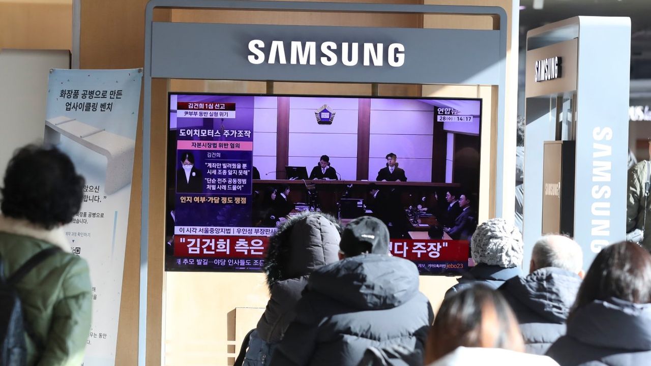 SEUL, 28 Ocak (Xinhua) -- Güney Kore'nin başkenti Seul'deki bir tren istasyonunda Kim Keon-hee'nin mahkeme duruşmasını canlı izleyen insanlar, 28 Ocak 2026. Güney Kore'de görevden alınan eski Devlet Başkanı Yoon Suk-yeol'un eşi Kim Keon-hee, yolsuzluk suçlamasıyla 20 ay hapis cezasına çarptırıldı. (Fotoğraf: Yao Qilin/Xinhua)■