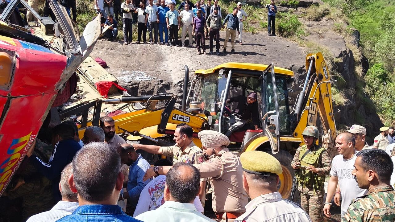 YENİ DELHİ, 21 Nisan (Xinhua) -- Hindistan kontrolündeki Keşmir'in Udhampur bölgesinde meydana gelen otobüs kazasının ardından olay yerinde kurtarma çalışmaları yürüten görevliler, 20 Nisan 2026. Hindistan kontrolündeki Keşmir'de bir otobüsün yoldan çıkarak engebeli araziden aşağıya yuvarlanması sonucu en az 21 kişi hayatını kaybederken 61 kişi de yaralandı. Yaralılardan bazılarının durumunun kritik olduğu belirtildi. (Fotoğraf: UNI/Dağıtım Xinhua aracılığıyla)■