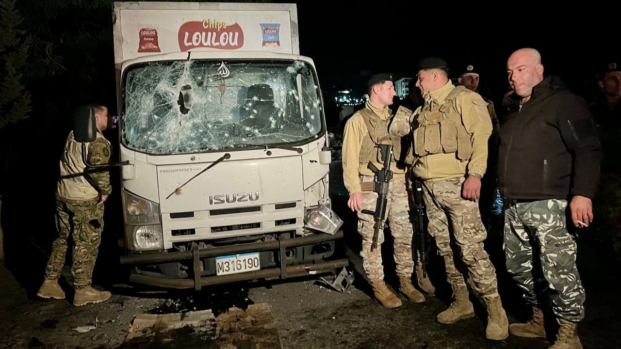 SEBLİNE, 17 Aralık (Xinhua) -- Lübnan'ın Sebline kasabasında İsrail'e ait insansız hava aracı (İHA) tarafından hedef alınan bir kamyonun önünde duran Lübnan ordusuna mensup askerler, 16 Aralık 2025. Resmi ve güvenlik kaynaklarına göre, İsrail'in salı günü öğleden sonra Lübnan'ın güneyi ile Lübnan Dağı'nın Chouf bölgesinde araçları hedef alan hava saldırılarında 2 kişi hayatını kaybetti, 5 kişi yaralandı. (Fotoğraf: Ali Hashisho/Xinhua)■