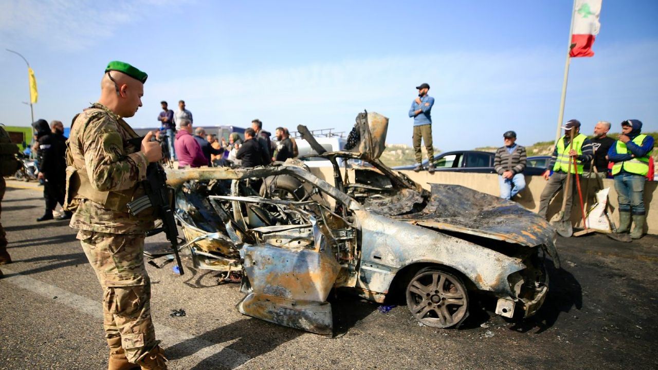ANSARİYAH, 3 Şubat (Xinhua) -- Lübnan'ın güneyindeki Ansariyah bölgesinde İsrail'e ait bir insansız hava aracının (İHA) hedef aldığı bir aracın etrafında olan insanlar, 2 Şubat 2026. İsrail'in pazartesi günü Lübnan'ın güneyine düzenlediği iki ayrı hava saldırısında 1 kişi hayatını kaybederken, 8 kişi yaralandı. Lübnan Sağlık Bakanlığı'nın açıklamasına göre ülkenin güneyindeki Ansariyah bölgesinde bir aracı hedef alan saldırıda bir kişi hayatını kaybetti, 4 kişi yaralandı. Sur kentindeki saldırılarda ise 4 kişi yaralandı. (Fotoğraf: Ali Hashisho/Xinhua)■