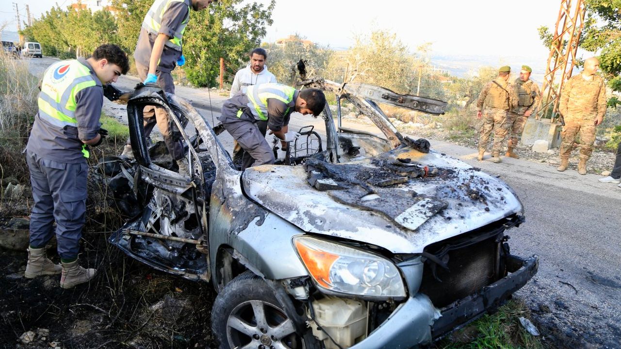 CÜVEYYA, 8 Ocak (Xinhua) -- Lübnan'ın Cüveyya köyünde İsrail hava saldırısının hedef aldığı araçta incelemelerde bulunan Lübnan ordusu askerleri ve sağlık görevlileri, 7 Ocak 2026. Lübnan kaynaklarına göre İsrail'in çarşamba öğleden sonra düzenlediği hava saldırısında bir Hizbullah üyesi hayatını kaybederken, bir diğeri de yaralandı. (Fotoğraf: Ali Hashisho/Xinhua)■