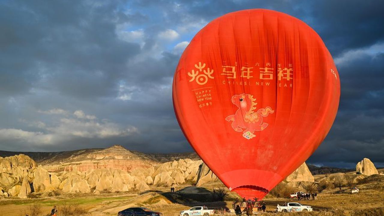 İSTANBUL, 20 Şubat (Xinhua) -- Türkiye'nin önemli turistik merkezlerinden Kapadokya'da dondurucu rüzgar eşliğinde yükselen sıcak hava balonlarının turuncu alevleri sessizliği bozarken kararan gökyüzünde Çince harflerle yazılmış 'At Yılı kutlu olsun' ifadesi parlıyor.