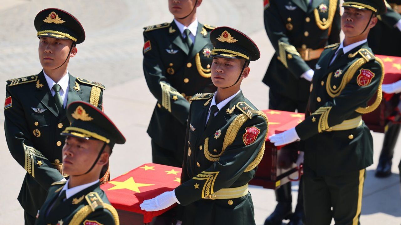 SHENYANG, 23 Nisan 2026 (Xinhua) -- Çin'in kuzeydoğusundaki Liaoning eyaletinin merkezi Shenyang'daki Çin Halkı Gönüllüleri şehitleri mezarlığında düzenlenen törende Çin Halkı Gönüllüleri askerlerine ait naaşların bulunduğu tabutlara eşlik eden şeref kıtası, 13 Eylül 2025. ABD Saldırganlığına Direnme ve Kore'ye Yardım Savaşı (1950-1953) sırasında hayatını kaybeden 12 Çin Halk Gönüllüleri askerinin naaşı perşembe günü Shenyang'da toprağa verildi. Askerlerin naaşları çarşamba günü Güney Kore'den Çin'e getirilmişti. (Fotoğraf: Han He/Xinhua) ■