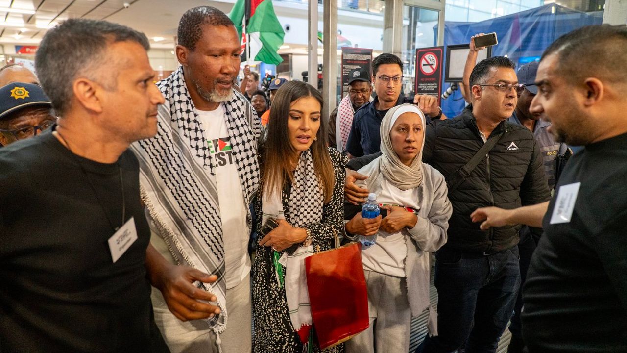 JOHANNESBURG, 9 Ekim (Xinhua) -- Nelson Mandela'nın torunu Mandla Mandela (soldan ikinci, önde) ve eşi, Güney Afrika'nın Johannesburg kentindeki OR Tambo Uluslararası Havalimanı'nda düzenlenen basın toplantısının ardından havalimanından ayrılıyorlar, 8 Ekim 2025. Gazze'ye insani yardım ulaştırmaya çalışırken İsrailli yetkililer tarafından gözaltına alınan Küresel Sumud Filosu'ndan altı Güney Afrikalı aktivist çarşamba günü Johannesburg'a döndü. (Fotoğraf: Shiraaz Mohamed/Xinhua)■