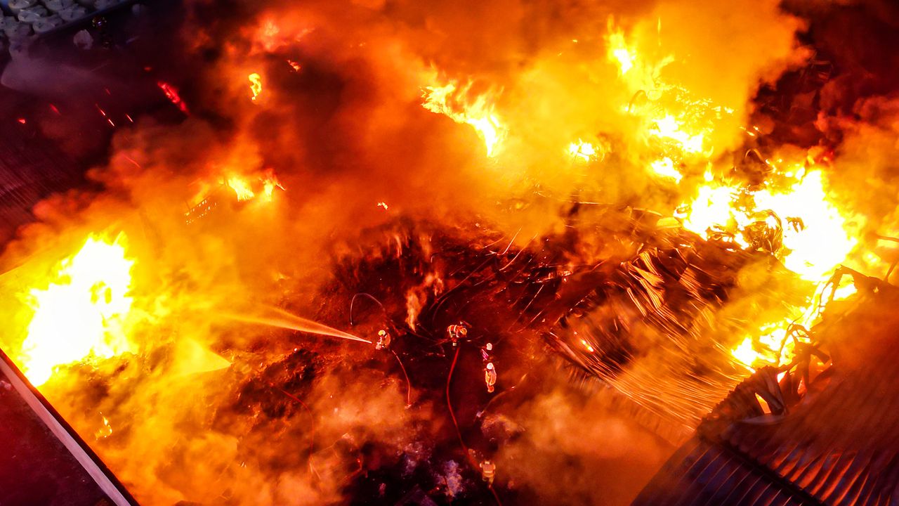 EL CEHRE, 3 Kasım (Xinhua) -- Havadan drone ile çekilen fotoğrafta, Kuveyt'in El Cehre vilayetindeki bir fabrikada çıkan yangını söndürmeye çalışan itfaiyeciler görülüyor, 2 Kasım 2025. Kuveytli itfaiyeciler, pazar akşamı Kuveyt'in El Cehre vilayetinde alüminyum, cam elyaf malzemeler ve lityum pillerin bulunduğu bir fabrikada çıkan büyük yangını başarıyla kontrol altına aldı. Yangının nasıl meydana geldiği hala araştırılırken, yangın sonucu herhangi bir can kaybı yaşanmadığı bildirildi. (Fotoğraf: Asad/Xinhua)■