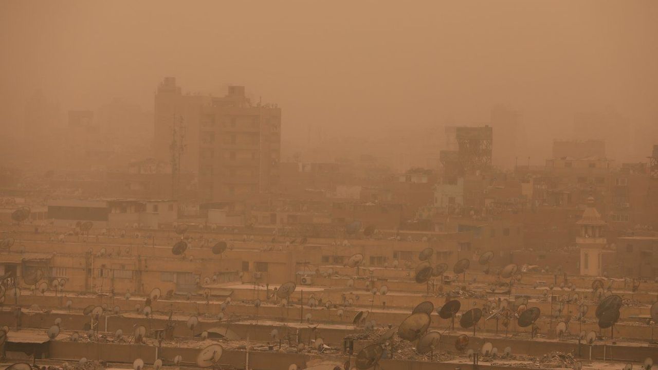 KAHİRE, 15 Mart (Xinhua) -- Mısır'ın başkenti Kahire'de yaşanan kum fırtınası sırasında kum ve tozla kaplanan binalar, 14 Mart 2026. (Fotoğraf: Ahmed Gomaa/Xinhua)■