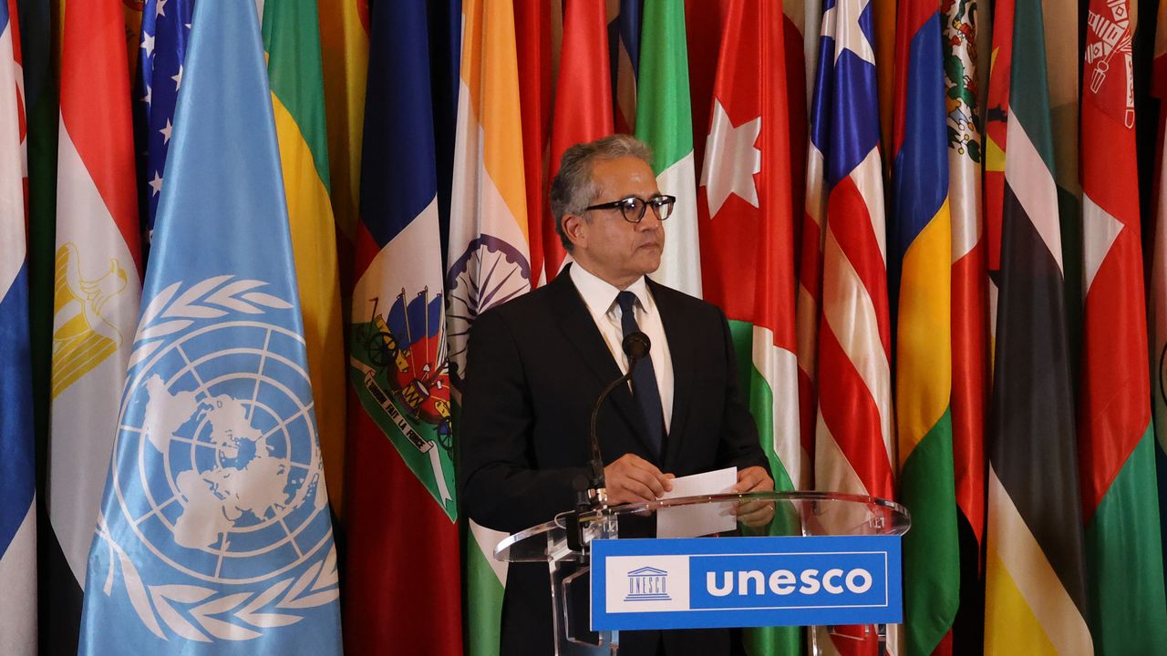 PARİS, 7 Ekim (Xinhua) -- Fransa'nın başkenti Paris'te UNESCO Genel Direktörlüğü seçimini kazandıktan sonra konuşma yapan Mısır'ın eski Turizm ve Eski Eserler Bakanı Halid el-Anani, 6 Ekim 2025. El-Anani, pazartesi günü Paris'te düzenlenen UNESCO Yürütme Kurulu'nun 222. Oturumu'nda UNESCO Genel Direktörlüğü görevine tek aday olarak gösterildi. (Fotoğraf: Zhang Baihui/Xinhua)■