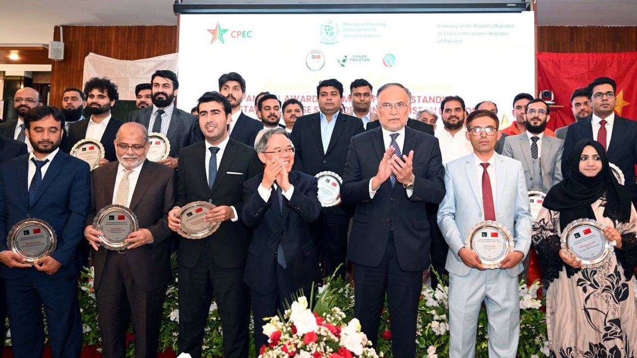 İSLAMABAD, 3 Nisan (Xinhua) -- Çin'in Pakistan Büyükelçisi Jiang Zaidong (önde soldan dördüncü) ve Pakistan Planlama, Kalkınma ve Özel Girişim Bakanı Ahsan İkbal (önde sağdan üçüncü), Pakistan'ın başkenti İslamabad'da ödül alan Pakistanlı çalışanlarla fotoğraf çektirdi, 31 Mart 2026. İkbal, Çin-Pakistan Ekonomik Koridoru'nun başarılı bir şekilde hayata geçirilmesinin, iki ülke arasındaki sarsılmaz ve her koşulda geçerli stratejik bağın güçlü bir kanıtı olduğunu belirtti. Bakan, geçtiğimiz günlerde düzenlenen 2026 Çin-Pakistan Ekonomik Koridoru Projeleri Üstün Başarılı Pakistanlı ve Çinli Personel Yıllık Ödül Töreni'nde yaptığı konuşmada, güvene dayalı bu ortaklığın işbirliği yoluyla güçlendiğini ve ortak refah vizyonuyla daha da pekiştirildiğini ifade etti. (Fotoğraf: Ahmad Kamal/Xinhua)■