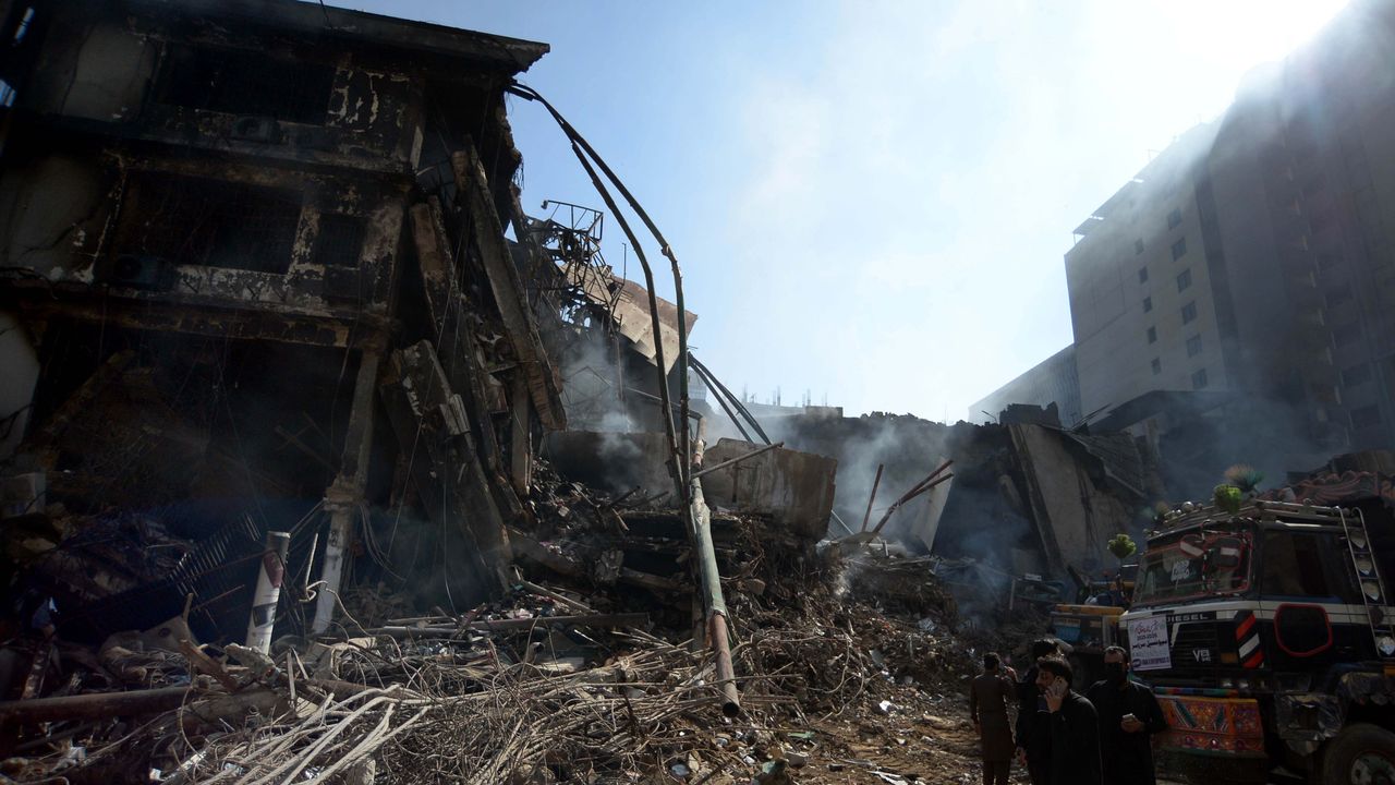 KARAÇİ, 21 Ocak (Xinhua) -- Pakistan'ın güneyindeki liman kenti Karaçi'de alışveriş merkezinde çıkan büyük yangında binanın hasar gören bir kısmı, 20 Ocak 2026. Pakistan'ın güneyindeki liman kenti Karaçi'de çok katlı alışveriş merkezinde çıkan büyük yangında hayatını kaybedenlerin sayısı salı günü itibarıyla 26'ya yükselirken, 74 kişiden ise hala haber alınamıyor. (Fotoğraf: Str/Xinhua)■