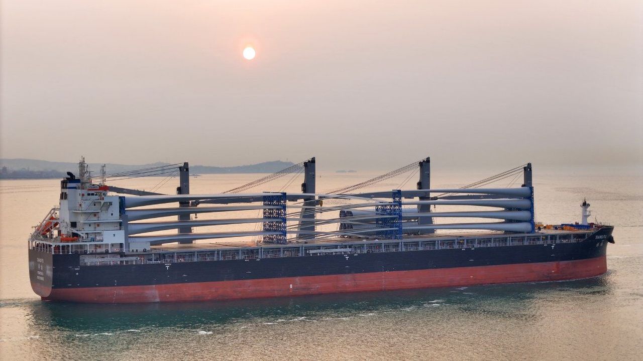 JİNAN, 29 Mart (Xinhua) -- Havadan drone ile çekilen fotoğrafta, Avusturya'ya ihraç edilmek üzere rüzgar enerjisi ekipmanlarıyla yüklü bir kargo gemisinin Çin'in doğusundaki Shandong eyaletindeki Yantai Limanı'nın Penglai Liman Bölgesi'nden yola çıktığı görülüyor, 28 Mart 2026. Çin'in Penglai Liman Bölgesi'nden cumartesi günü yedi set yerli üretim rüzgar türbini ekipmanı Avusturya'ya gönderildi. (Fotoğraf: Tang Ke/Xinhua)■