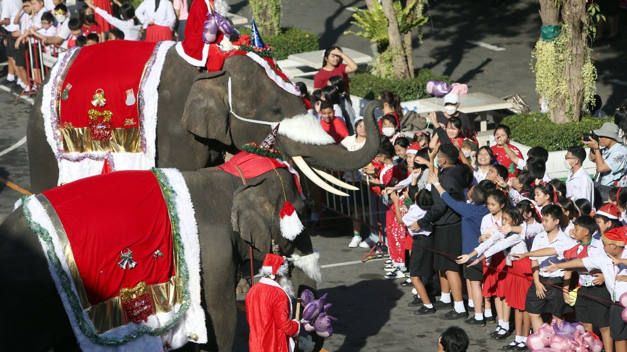 AYUTTHAYA, 25 Aralık (Xinhua) -- Tayland'ın Ayutthaya kentindeki bir okulda düzenlenen Noel kutlamasında Noel kostümü giydirilmiş fillerle etkileşime giren öğrenciler, 24 Aralık 2025. (Fotoğraf: Rachen Sageamsak/Xinhua)■