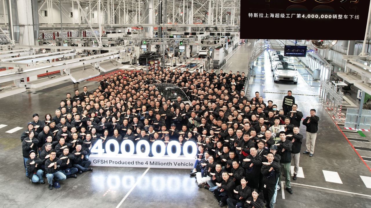 SHANGHAİ, 8 Aralık (Xinhua) -- Çin'in doğusundaki Shanghai kentinde Tesla'nın giga fabrikasında üretilen 4 milyonuncu aracı kutlamak için grup fotoğrafı çektiren çalışanlar, 8 Aralık 2025. (Fotoğraf: Tesla Shanghai Giga Fabrikası/Dağıtım Xinhua aracılığıyla)■
