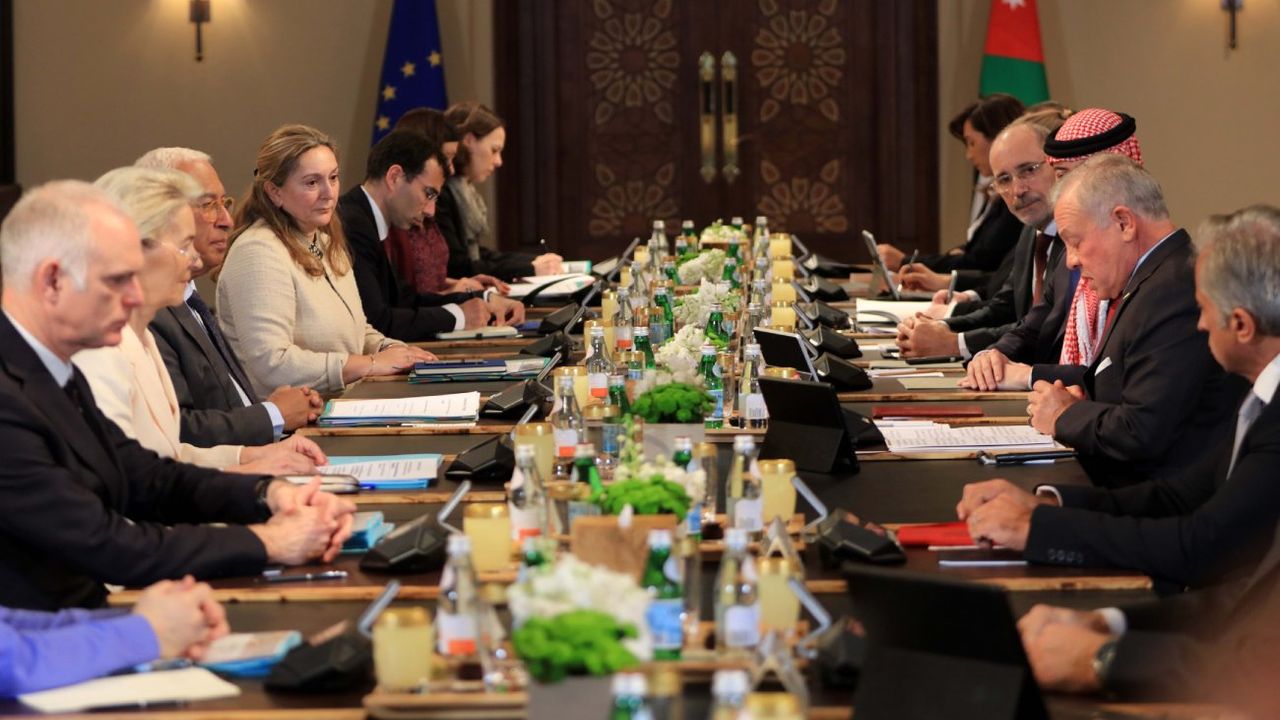 AMMAN, 9 Ocak (Xinhua) -- Ürdün'ün başkenti Amman'daki El-Hüseyniye Sarayı'nda AB heyetiyle bir araya gelen Ürdün Kralı 2. Abdullah, 8 Ocak 2026. Ürdün ve Avrupa Birliği, perşembe günü Ürdün'ün başkenti Amman'da düzenlenen 1. Ürdün-AB Zirvesi'nin ardından ortak bir bildiri yayımladı. Bildiride, Gazze'ye insani yardım erişiminin artırılması çağrısında bulunularak iki devletli çözüme verilen destek yinelendi. (Fotoğraf: Mohammad Abu Ghosh/Xinhua)