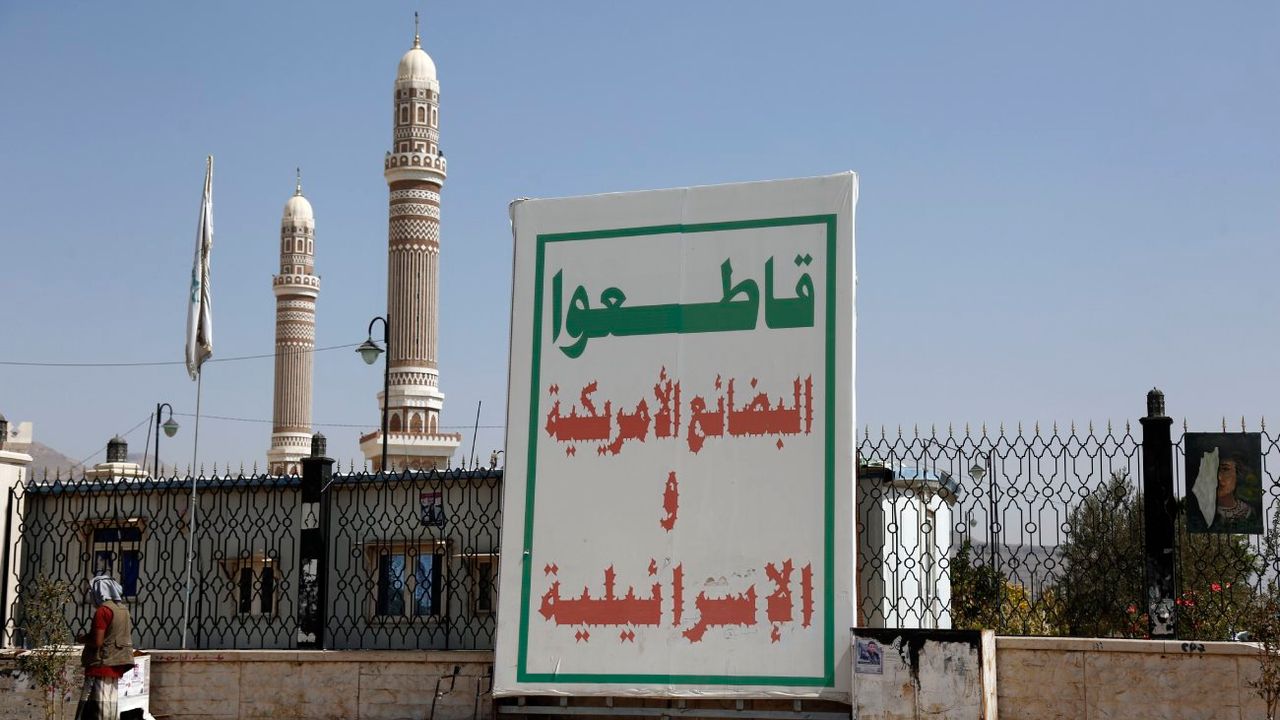 SANA, 6 Kasım (Xinhua) -- Yemen'in başkenti Sana'da ABD ve İsrail'e yönelik boykot çağrısının yer aldığı reklam panosu, 5 Kasım 2025. (Fotoğraf: Mohammad Mohammad/Xinhua)■